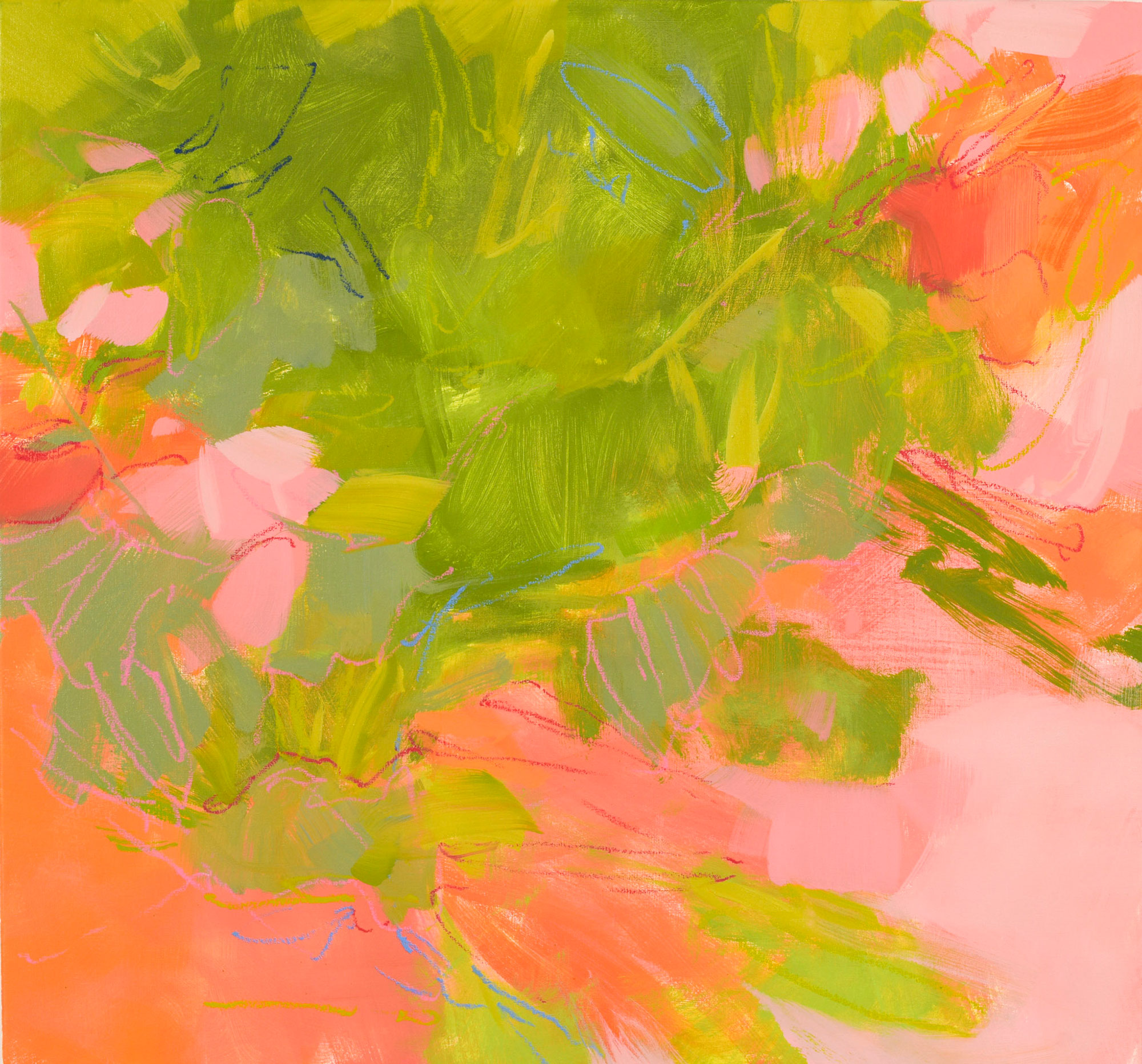 My pathway into abstraction stems from my background in both landscape and figurative painting, both of which remain a steady influence and inspiration of mine. I remain fascinated by gesture and the figurative aspects visible in nature, such as the way tree branches appear to reach out to each other, as if yearning to touch and connect.